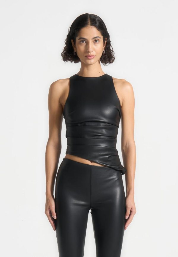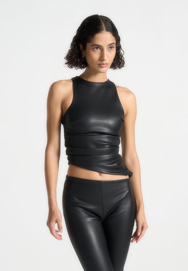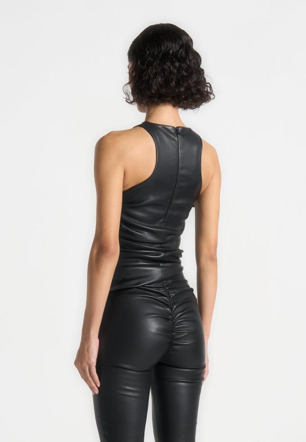 This top features a racer neck and a flattering fit, accentuated by gathered detailing. Crafted with premium leather, this top offers a sleek and sophisticated look that effortlessly elevates any outfit.