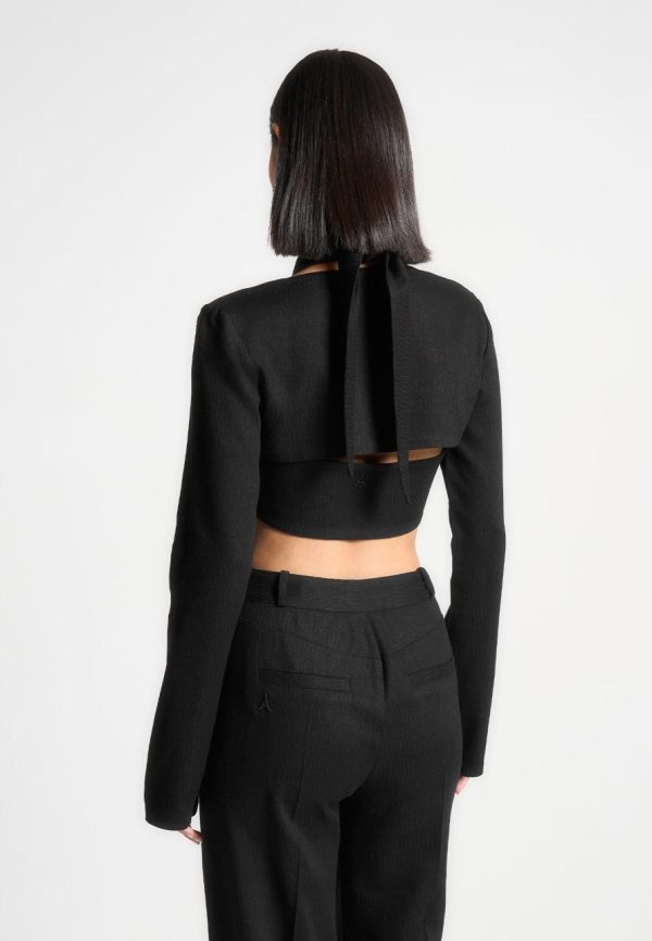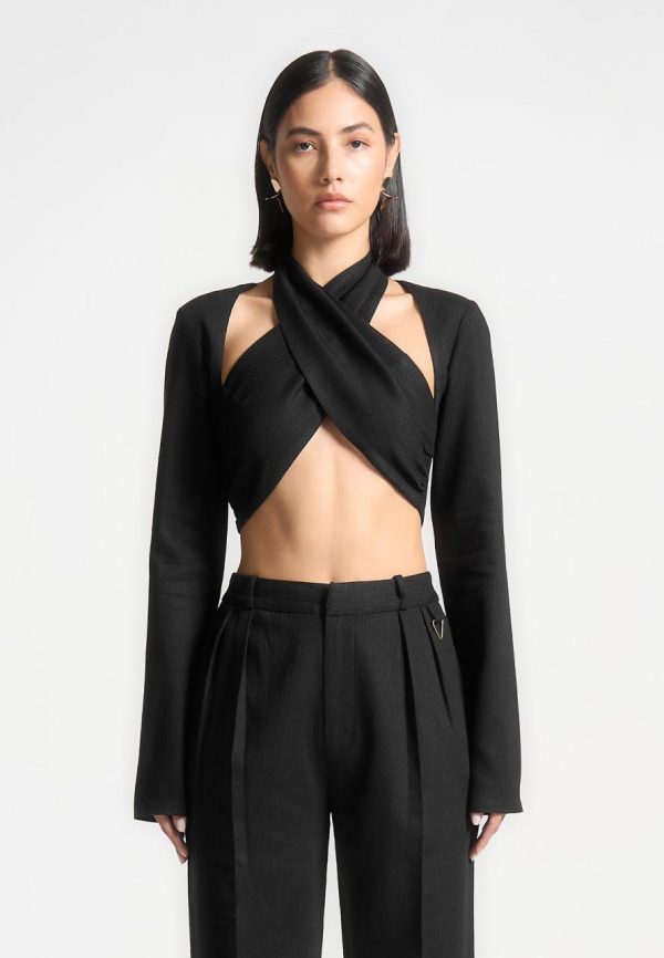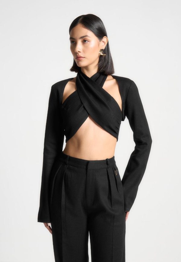 This black linen bolero top combines the classic halter neck style with a modern, on trend sleeve overlay. Perfect for any occasion, this top is both chic and comfortable with its soft, breathable fabric. Add to your wardrobe with this on trend piece.