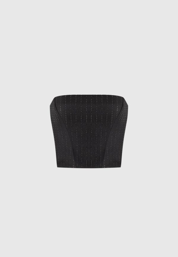 Create a timeless look with our Rhinestone Tailored Bandeau Corset Top in Black. This classic silhouette exudes elegance and subtle sparkle, making it the perfect addition to your wardrobe. The tailored fit provides a classy touch to any outfit. Elevate your style with this must-have piece.