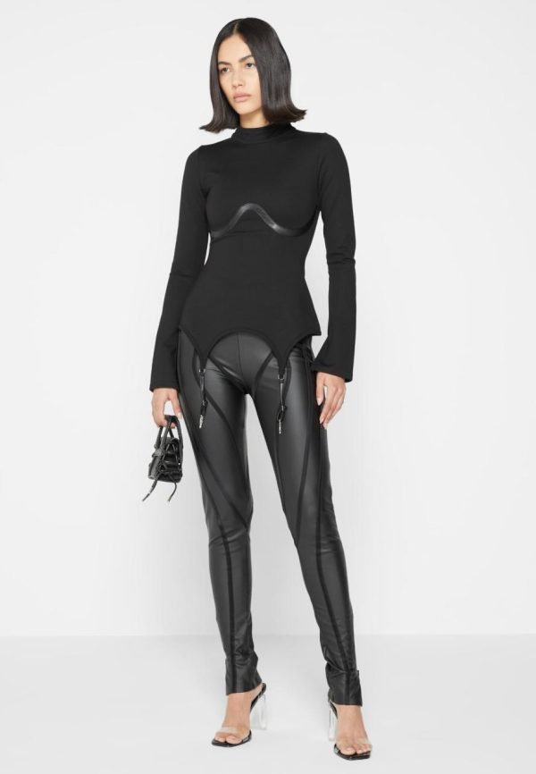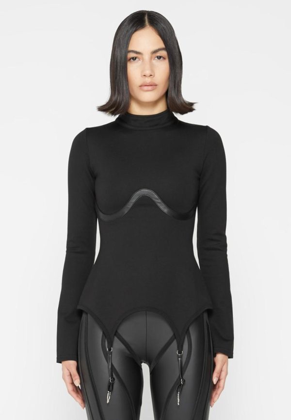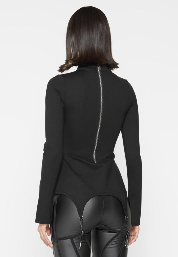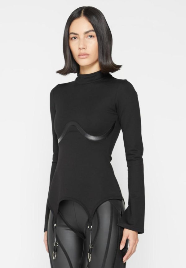 This black Suspender Detail Top features a unique suspender hem design and a flattering fit, making it a must-have addition to your wardrobe. The suspender hem adds a touch of edginess, while the flattering fit is designed to enhance your silhouette. Elevate your style with this versatile top.